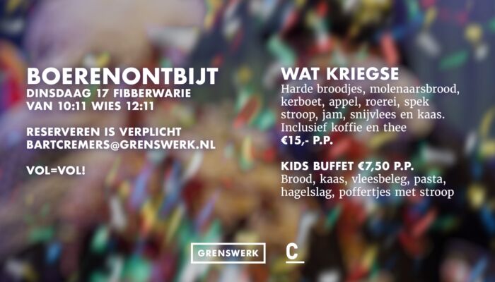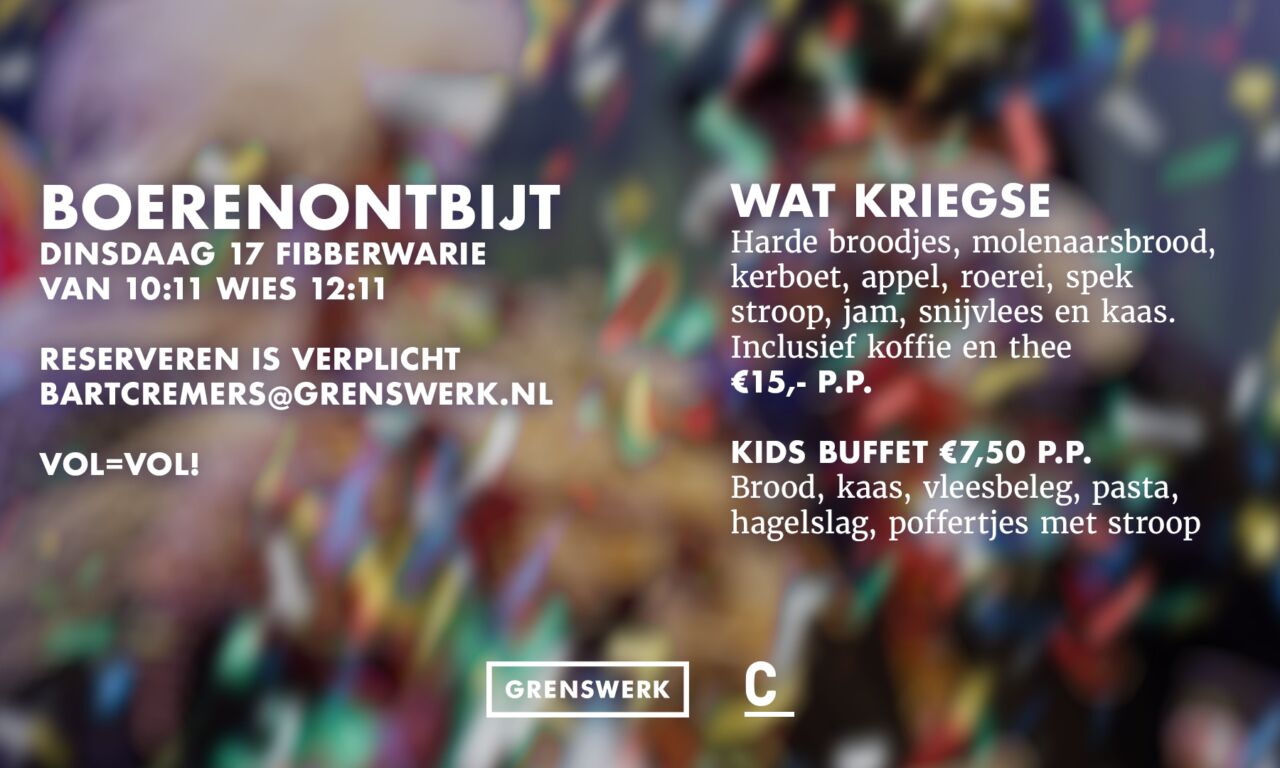 Op dindaag 17 fibberwarie van 10:11 wies 12:11 is het Boerenontbijt in Grenswerk Café! Wat kriegse? Harde broodjes, molenaarsbrood, kerboet, appel, roerei, spek, stroop, jam, snijvlees en kaas. Det alles inclusief koffie en thee voor €15,- p.p. Kids schuve aan veur maar €7,- p.p en kriege brood, kaas, vleesbeleg, pasta, hagelslag en poffertjes met stroop.