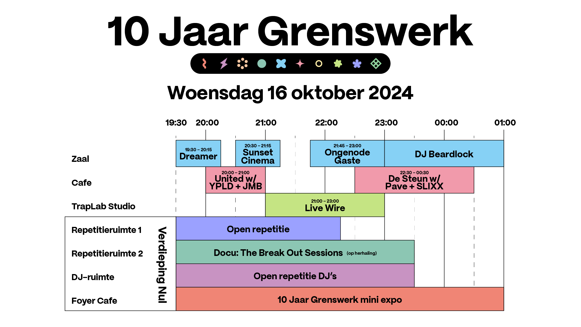 In de maand oktober wordt dit heugelijke feit gevierd met een grote concertreeks en staat er een divers programma in Grenswerk: onder andere shows van Belgische indie/dreampop van Portland, Van Dik Hout viert 30 Jaar ‘Stil in Mij’ en rapper Hef, die onlangs nog Ahoy wist uit te verkopen. Ook van de partij zijn Afterpartees uit Horst, die samen met Pip Blom op het affiche staan en een clubnacht in samenwerking met TrapLab Radio iet Doppelgang en + Luca v/d Hombergh b2b Six Feet Up + Ilex.
