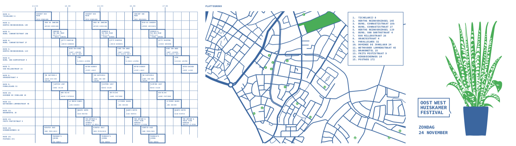 Het festival vindt dit jaar in de wijk Venlo-Oost plaats. Op deze manier is het voor publiek eenvoudig om op loop- of fietsafstand meerdere huiskamers te bezoeken. Volgend jaar zal weer een andere wijk gekozen worden. De optredens duren van 13:00 tot 18:00 uur.