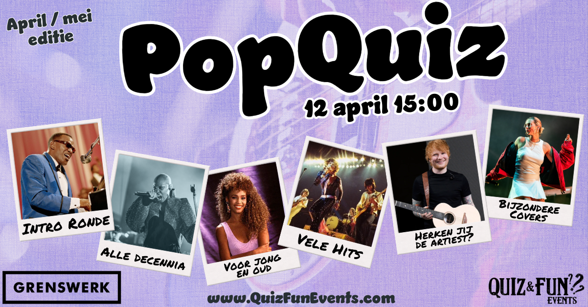Het is tijd voor een nieuwe ronde, nieuwe vragen en een compleet frisse PopQuiz! In april staat er een gloednieuwe PopQuiz klaar in Venlo bij Grenswerk. Verwacht een avond vol herkenbare hits, verrassende fragmenten en muzikale uitdagingen die je van begin tot eind scherp houden.
