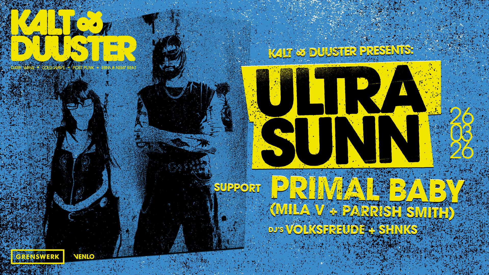 Kalt & Duuster is meer dan een concertreeks — elke editie combineert live-acts met een doorlopende DJ-setting. Ook bij Ultra Sunn staat de dansvloer centraal: DJ’s Volksfreude en SHNKS draaien vóór, tussen en na de live-sets en trekken de clubnacht door tot na de laatste act. De avond beweegt zich continu tussen live performance en club, met in deze editie EBM, dark wave en new beat als verbindende rode draad.