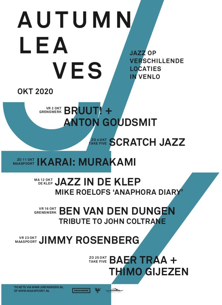 Poppodium Grenswerk, De Maaspoort Theater & Events, Café Take Five en Café de Klep hebben zich wederom samengepakt en organiseren een reeks jazzconcerten in het seizoen waar jazz voor gemaakt lijkt, de herfst. Alle concerten van Autumn Leaves zullen corona-proof worden ingestoken. Dit betekent een beperkt aantal bezoekers en verdere maatregelen. Deze maatregelen verschillen per podia en zijn te vinden via de websites van Grenswerk en de Maaspoort. Losse tickets voor de concerten zijn verkrijgbaar via de websites van Grenswerk en de Maaspoort. Er is dit jaar geen passepartout mogelijkheid.